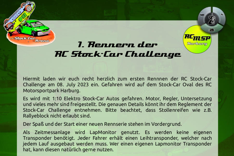 Hiermit laden wir euch recht herzlich zum ersten Rennnen der RC Stock-Car Challenge am 08. July 2023 ein. Gefahren wird auf dem Stock-Car Oval des RC Motorsportpark Harburg. Alle Details findet ihr in der untenstehenden PDF Datei.